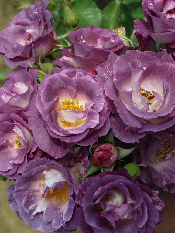 Floribunda starinske plave, tj. purpurne boje. Cvjetovi u grozdovima, vrlo neobična ruža.