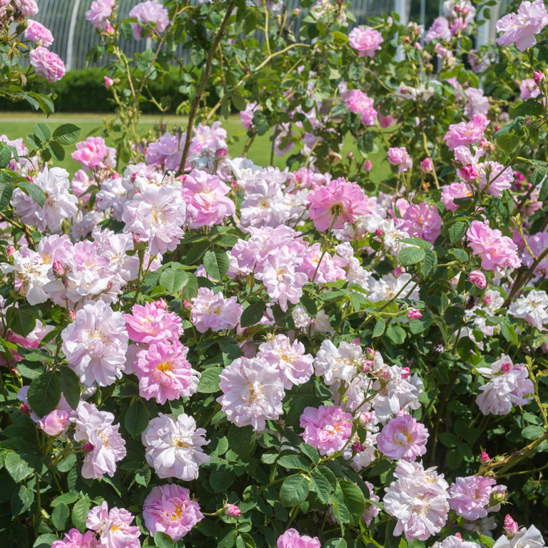 Cvjetovi poludvostruki intenzivnog mirisa. Stvaraju se u grozdovima. Boja cvjetova je nježoroza do bijela. Tipična damaščanska ruža. I lišće ima izražen miris. Cvate jednom.