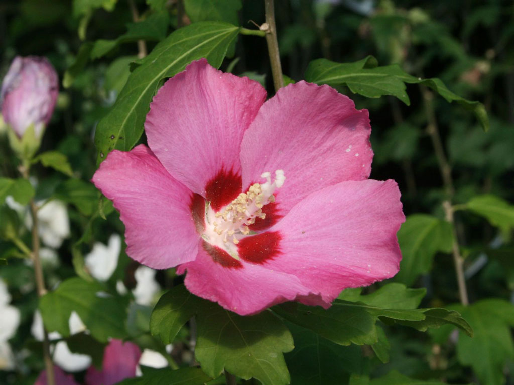 Idealno rješenje za one koji vole sjajno obojane cvjetove u ljetnim mjesecima. Cvjetovi svjetloroza boje s jarkim crvenim okom u središtu cvijeta. Rezidba skoro i nije potrebna, no obično se u proljeće grane prikračuju za jednu trećinu.