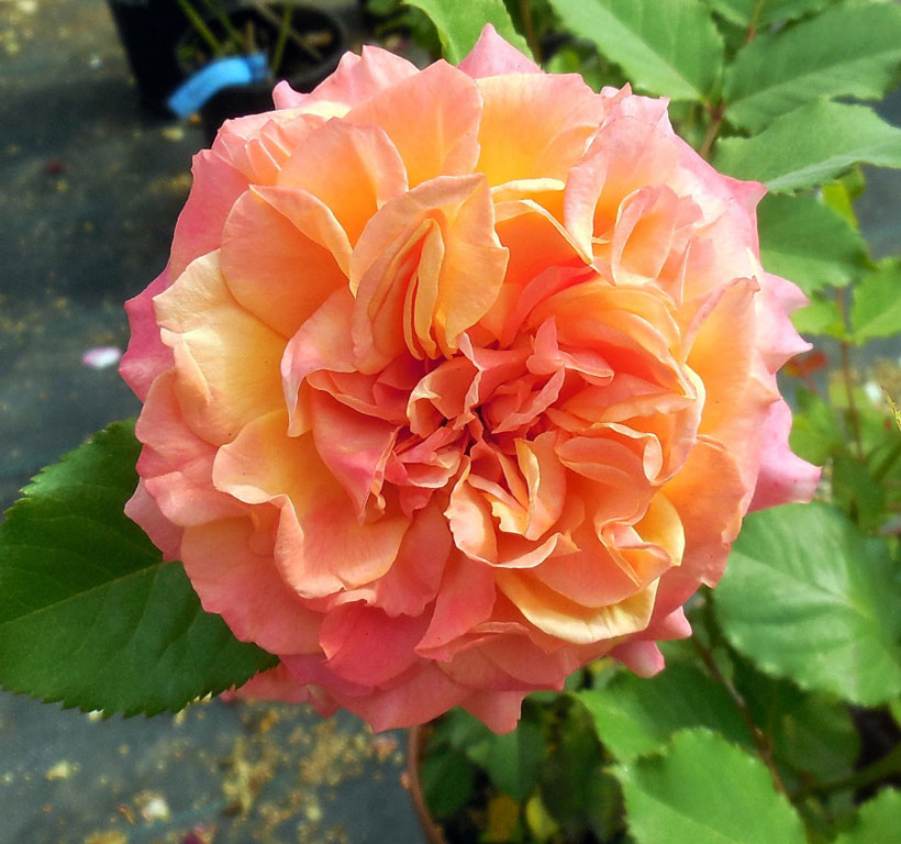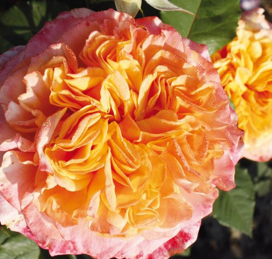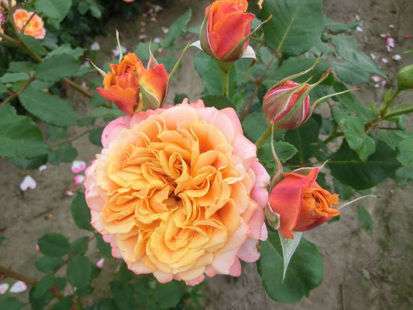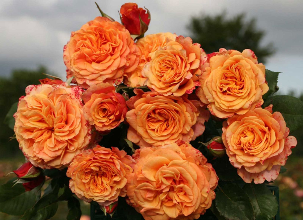 Novija grmolika ruža. Cvjetovi u grozdovima, žive mareličaste boje s blago roza rubovima.