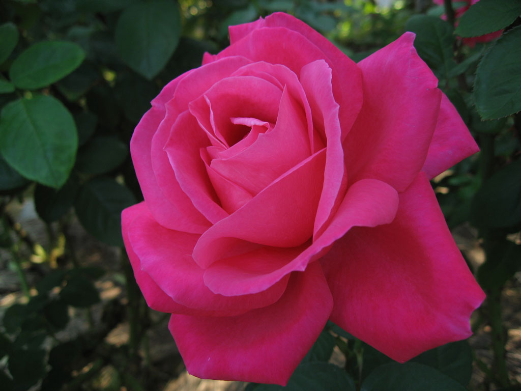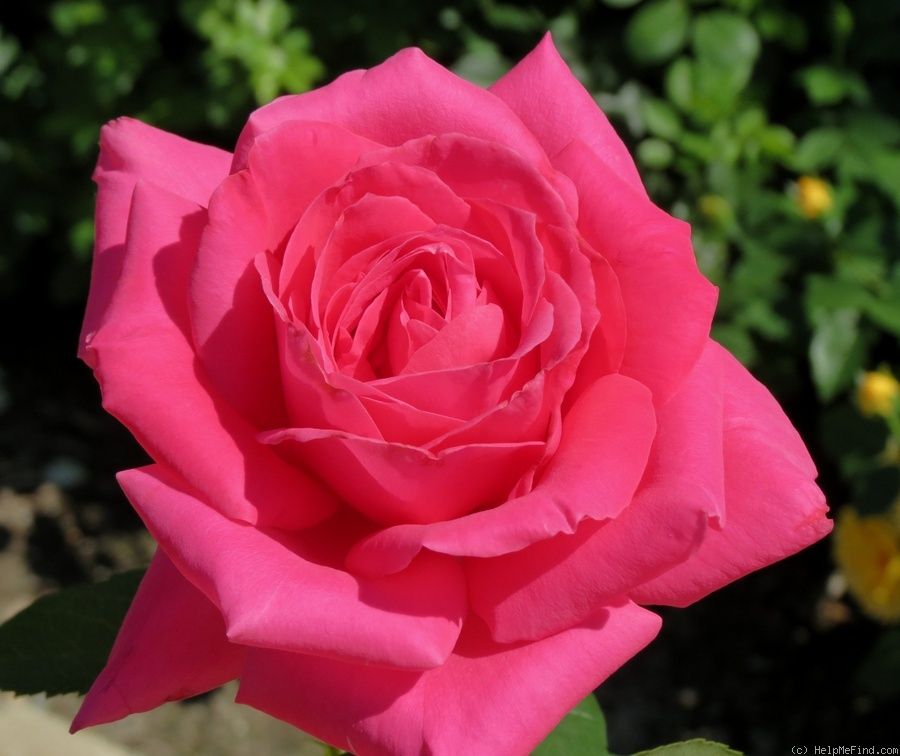 Starija bujna hibridna čajevka krupnih cvjetova žive tamnoroza boje i jakog mirisa.