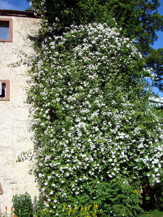 Izrazito bujna rambler penjačica sitnih bijeloroza cvjetova izrazitog mirisa. Cvate jednom u kasno proljeće.