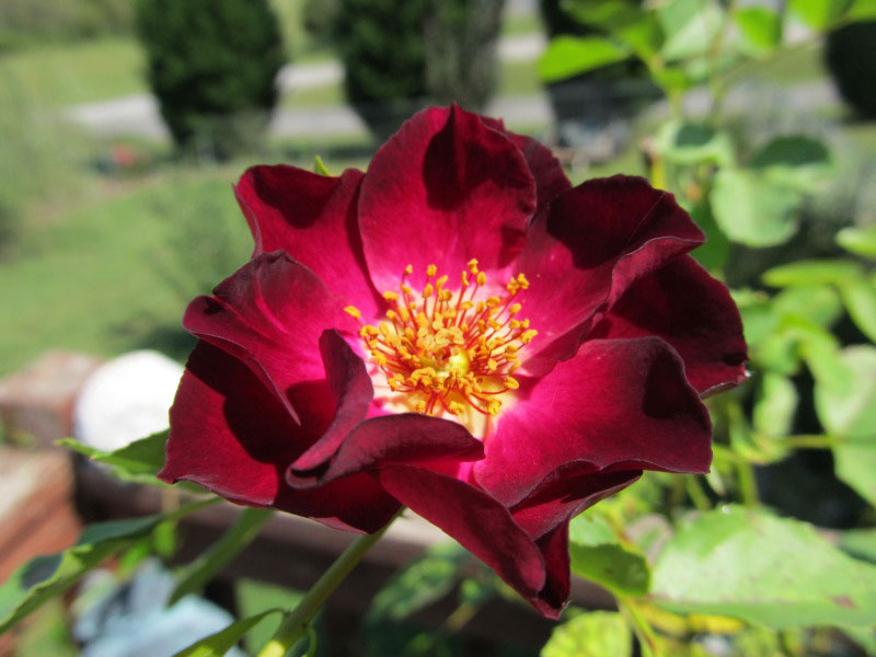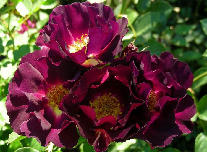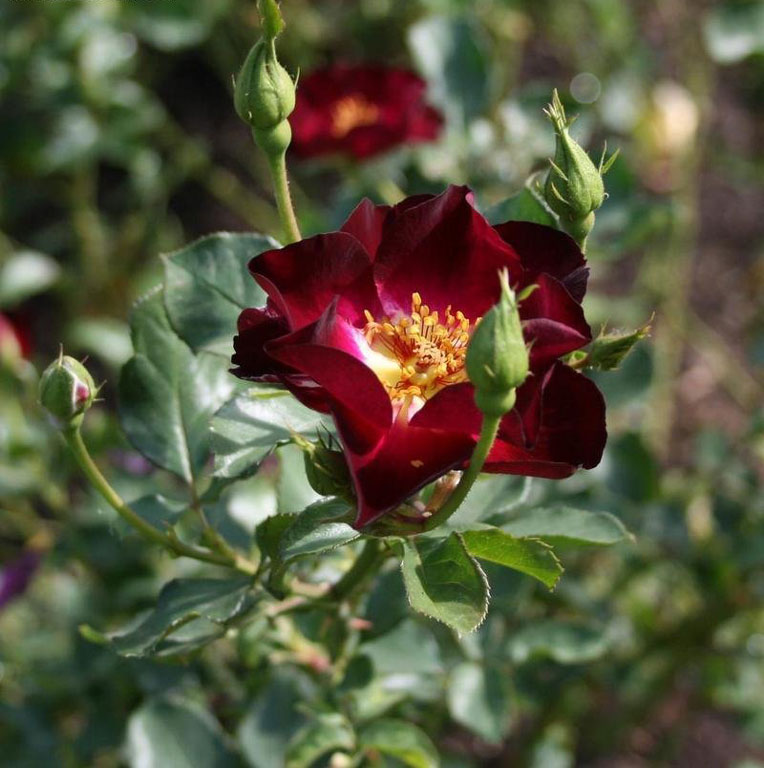 Grmolika ruža s jednostavnim cvjetovima žive purpurne boje sa žutim okom u sredini. Cvjetovi u grozdovima.