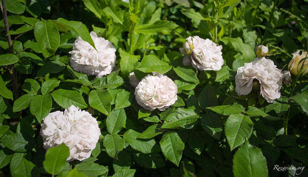 Bijela verzija starinske portland ruže Jacques Cartier nastala u novije vrijeme. Obnavlja cvatnju. Miris snažan, otporna na bolesti. Tolerantna na hladovinu.